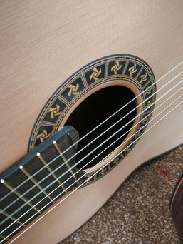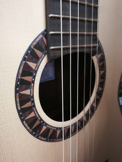 640mm European spruce soundboard with Amazon rosewood back and sides, ebony fingerboard with ebony bindings and head plate. The rosette is triangles of mahogany and ebony and a Madagascan rosewood bridge.